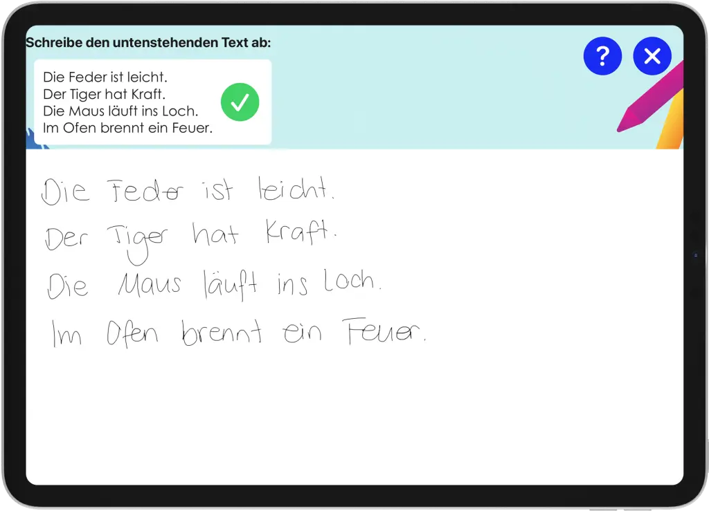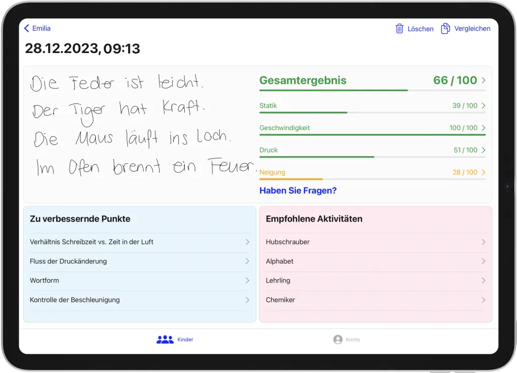 Um die Beurteilung abzuschließen, muss das Kind lediglich einen kurzen Text schreiben. Die Anwendung analysiert dann Tausende von Daten, darunter Druck, Geschwindigkeit, Beschleunigung und Stiftneigung, um ein umfassendes Profil der Handschrift des Kindes zu erstellen. Die Beurteilung ist daher eine schnelle und kostengünstige Möglichkeit, die Handschrift eines Kindes zu beurteilen und auf Dysgraphie zu testen.