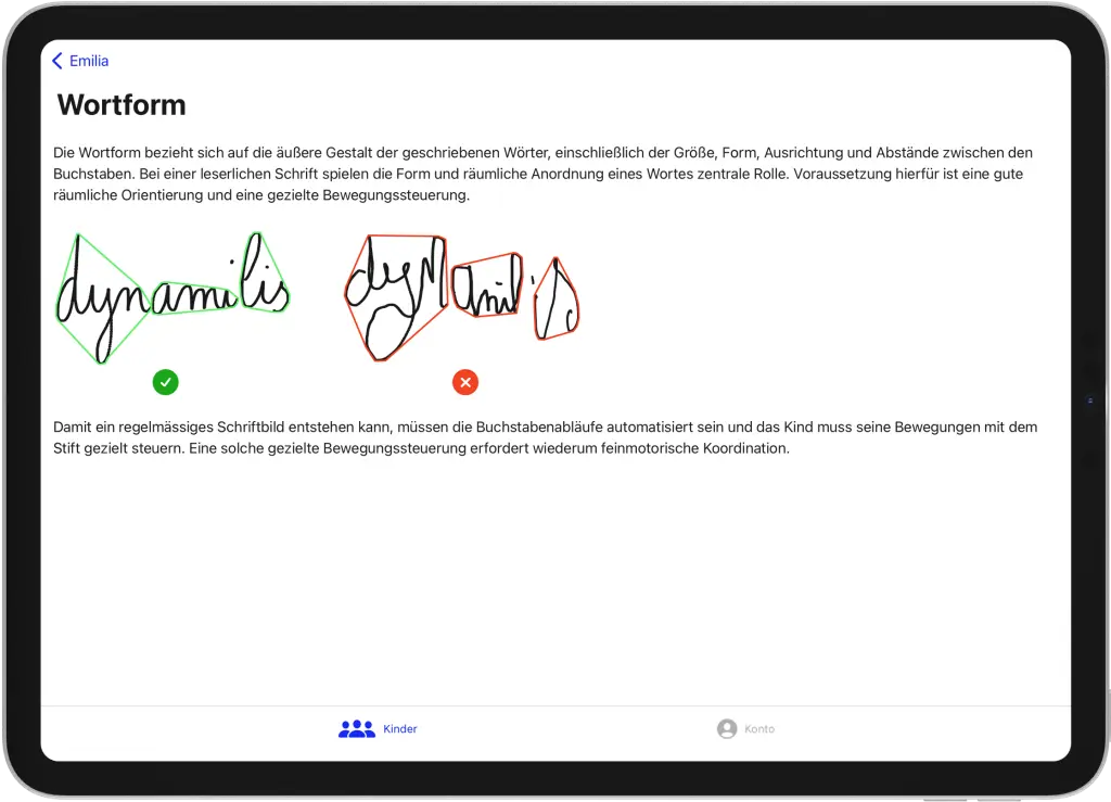 - Sobald die Beurteilung abgeschlossen ist, werden die Ergebnisse im Bereich des Betreuers angezeigt. Es wird eine allgemeine Punktzahl von 0 bis 100 angezeigt, welche die Handschrift des Kindes bewertet. Die App empfiehlt außerdem individuelle Handschriftaktivitäten, um die Schwächen zu verbessern