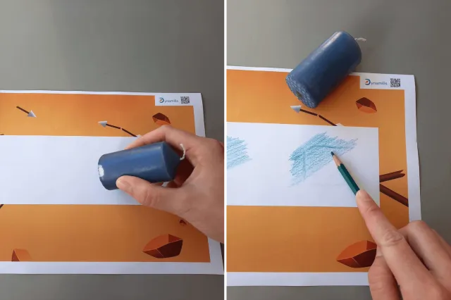 Use the back of a candle as your unconventional pencil to craft a mysterious symbol inside the white box on the template. Carefully remove any excess wax.