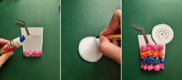 Get creative by cutting out the glass template and decorating it with the tissue paper balls. Glue these colorful balls onto the cocktail glass template.