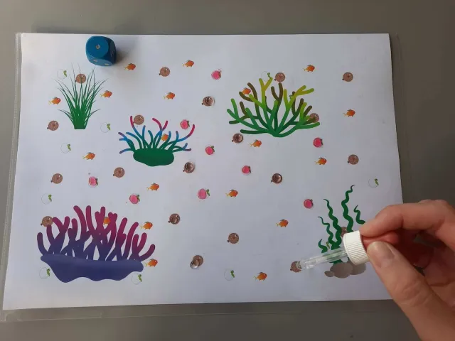 Put the underwater picture inside a plastic folder and give each player a pipet or syringe. For an added touch of vibrancy, you can add food coloring to the water.